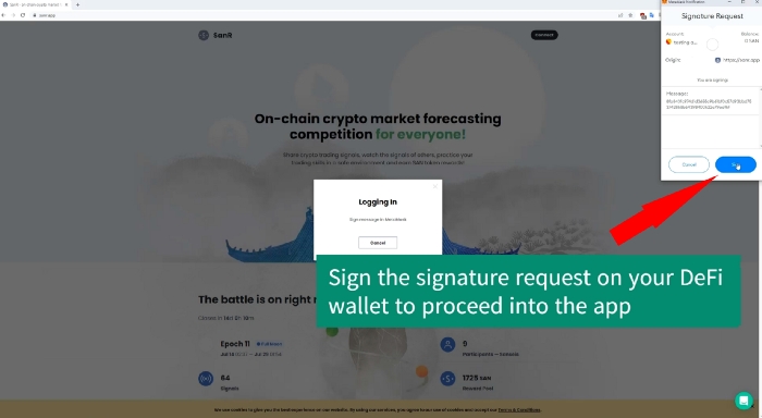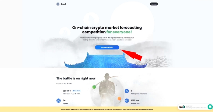 Once you have logged into SanR.app, we will be greeted by the landing page. Firstly, connect your DeFI wallet by clicking the connect button.