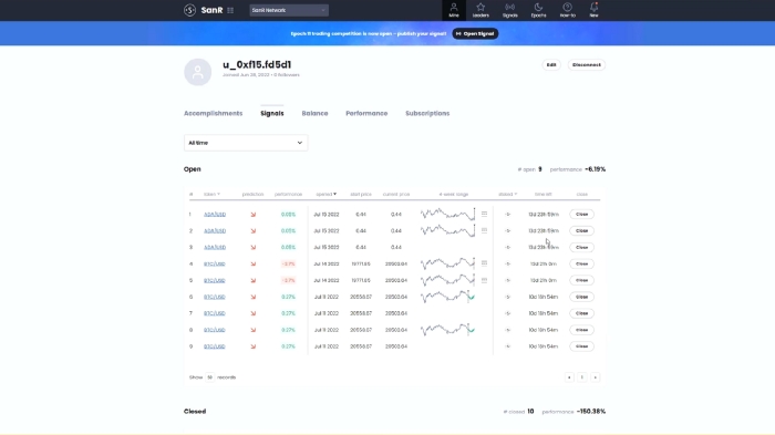 On the signals tab, we can then see the previous open and closed forecasts predicted and their current performance.